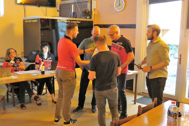 Zu Ehrenmitgliedern wurden die abtretenden H1-Teamchef Heini Sommer und U21-Head-Coach Mauro Montani, sowie die immer noch aktiven Trainer Manuel Stämpfli und Roland Münger ernannt. In einem spannenden «Kahoot» konnte einiges über die vier neuen Ehrenmitglieder erfahren werden. Leider mussten aber auch Abgänge in der Organisation vermeldet werden: dies betrifft (wie erwähnt) H1-Teamchef Heini Sommer, Materialwart Rafael Jordi und Präsident Jérôme Grütter. Grütter wird weiterhin im H2 aktiv sein. Auf eine bewegende Laudatio durch Brigitta Iseli an den scheidenden Präsidenten folgte eine Standing Ovation durch die anwesenden Vereinsmitglieder.
