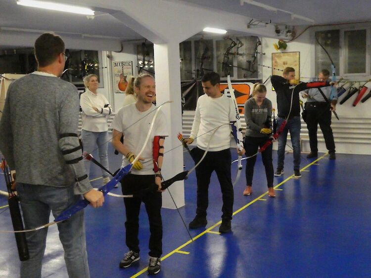 Dreizehn Jahre später nahmen zwei Spieler dieses Teams nun am «realen» Bogenschiessen teil… einer davon – Präsident Rolf Aeschlimann - gewann auch diese Herausforderung. Doch zuerst wurde natürlich die korrekte Positionierung, die Schiesshaltung und -technik gezeigt. Ab dann galt es ernst – das Spiel begann. Es war erstaunlich, wie schnell einige der Teilnehmenden das Gelbe in der Mitte getroffen haben. Und natürlich lockte die Herausforderung: wer macht es am besten, wenn es ernst gilt? Die Finalrunde bestritten schlussendlich Jérôme, Jenny, Rolf, Walter und Tobias.