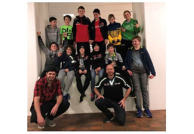 Auf dem Spielfeld: Alain, Robin, Nicole, Rhodin, Florian, Sven, Nicola, Lukas, Lenas, Janis, Mike
