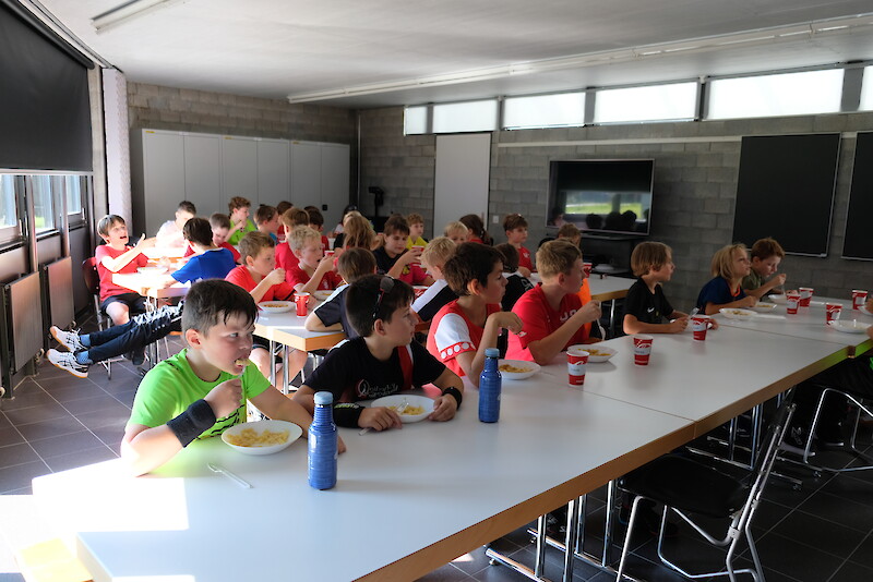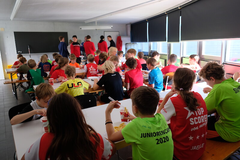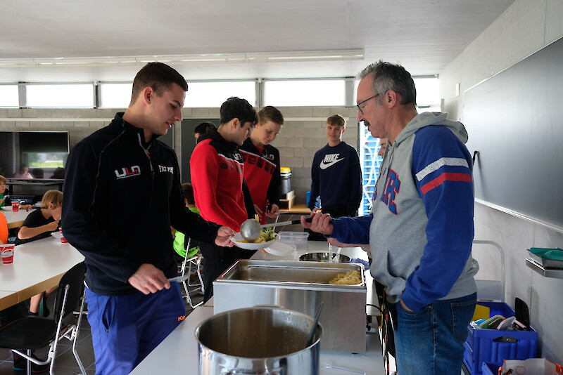 Das erste Mittagessen - Hörnli, Tomatensauce, Salat und zum Dessert ein leckeres Stück Cake - fand grossen Anklang - die Aufregung, die neuen Mitspieler und das Training hatten für ordentlich Hunger gesorgt!