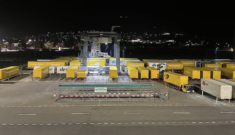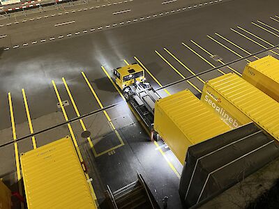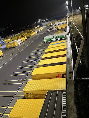 Aus Gründen des Postgeheimnisses war Fotografieren im Verteilzentrum leider nicht erlaubt. Ein Abstecher nach draussen ermöglichte jedoch, die Anlieferung bildlich festzuhalten. Die präzise Organisation der Containerlogistik beeindruckte besonders. Für den Winter ist bereits ein Gerüst aufgebaut, damit die Chauffeure ihre Container bequem vom allfälligen Schnee befreien können.