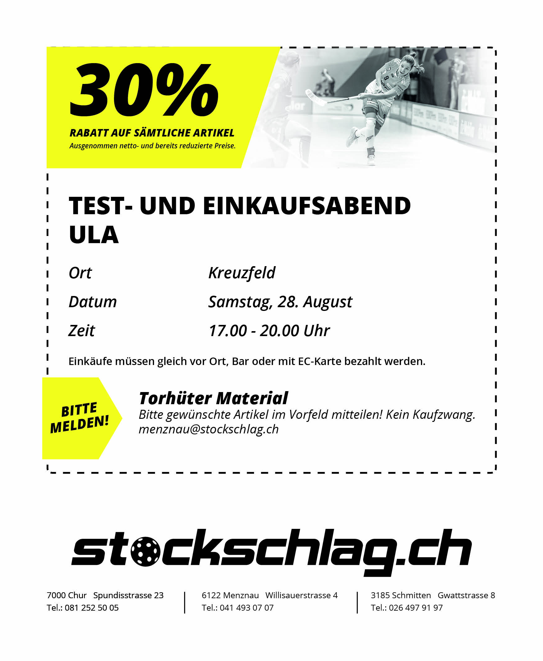 Nachdem während dem Tag die D-Junioren um den ULA-Cup fighten, empfängt unsere NLB-Mannschaft um 18.00 Uhr das Topteam aus der 1. Liga, die Lions Konolfingen, zu einem Vorbereitungsspiel (freier Eintritt). Anschliessend an den Match freuen wir uns auf ein gemütliches Beisammensein; für das leibliche Wohl ist mit einer leckeren ULA-Wurst, Getränken und Süssem gesorgt. Auch der "Stockschlag" ist mit Stöcken und der ULA-Vereinsbekleidung vor Ort.