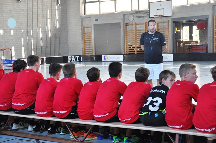 Bei den U14nern lagen die Schwerpunkte bei Abschluss und Schusstechnik. Auf humorvolle und leicht verständliche Weise erklärte der Schwede die Übungen. Dabei teilte er die Teams zur Auflockerung anhand der Schuhgrösse ein!? Dadurch entstanden die Teams „grosse Füsse“ und „kleine Füsse.“