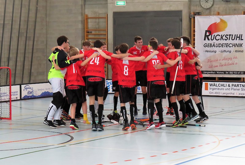 Nun stehen die Jungs um die Head-Coaches Beni Matter und Marcel Nyffenegger in der Endabrechnung auf Rang zwei hinter Bern Ost. Da Swiss Unihockey auf nächste Saison hin die U16A aufstocken wird, steigen die Gruppensieger direkt auf. Weil aber die Berner auf den Aufstieg verzichten, konnte ULA als zweitplatziertes Team erben. Präsident Jérôme Grütter liess es sich nicht nehmen, nach dem letzten Spiel den Jungs im Namen des gesamten Vereins herzlich zu gratulieren. Die Freude bei ULA über den Aufstieg in die höchste Spielklasse der U16 ist riesig, und es wurde ausgiebig mit einer alkoholfreien Champagnerdusche gefeiert.