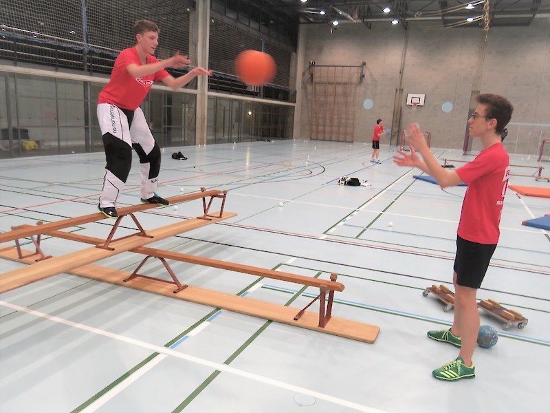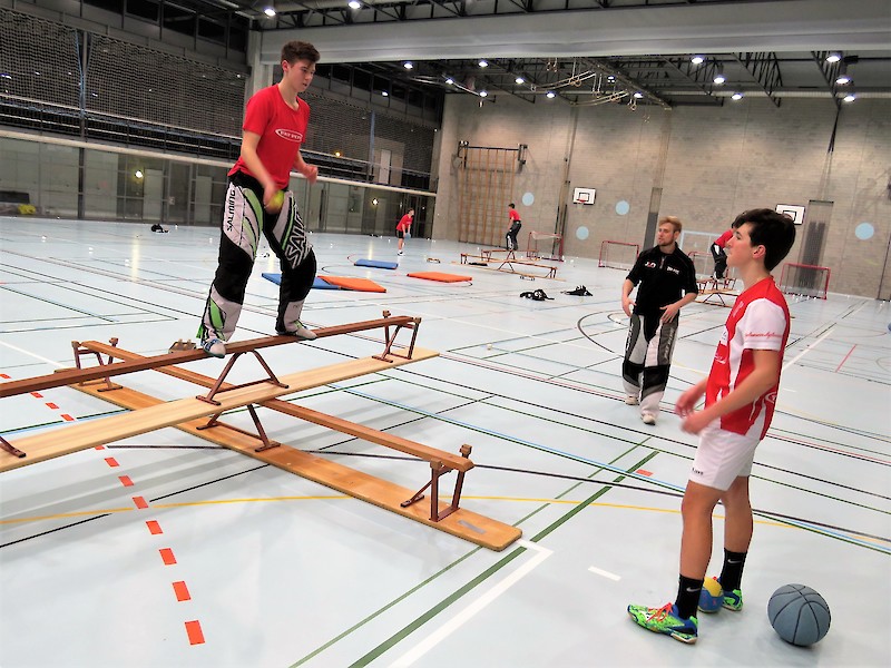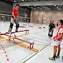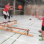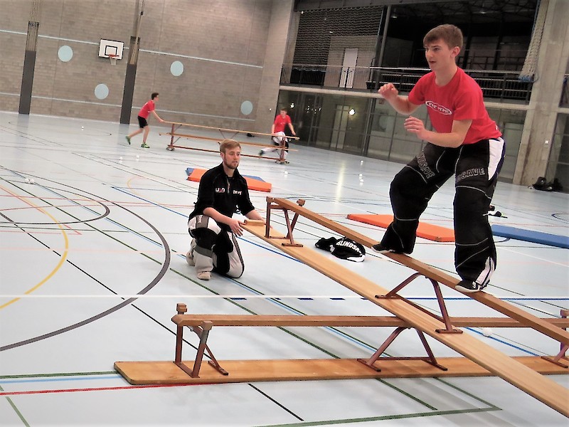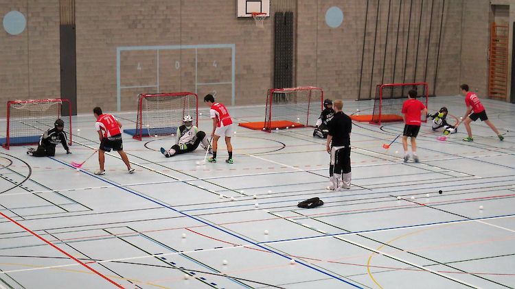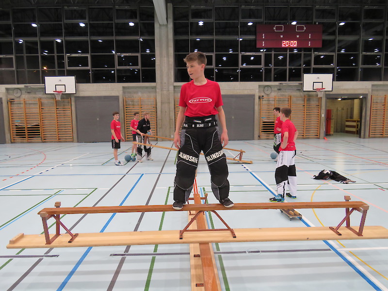 Danach ging es in die Halle - und ans Eingemachte. Die Mannschaftskollegen der vier Schlussmänner, Janis Krähenbühl, Gregor von Rohr, Nikita Satsukevic und Michael Iseli, brachten beim Einschiessen die Jungs auf Touren und knallten ihnen die Bälle um die Ohren, dass es einem bereits beim Zuschauen hätte schwindlig werden können. Es folgten eine Übung zum schnellen seitwärts Verschieben und ein Balanceakt auf kreuzweise gestapelten Bänklis. Mit verschiedenen Abschlussvarianten ging es weiter, um gegen Ende des Trainings zum krönenden Abschluss mit dem «Flying Dutchman» zu kommen. Bei dieser Übung werden zwei Tore nebeneinander aufgestellt. Zwei Spieler dreschen nun abwechslungsweise die Bälle ins rechte bzw. linke Tor und zwingen so den Torhüter zu schnellen und sehr kräfteraubenden Hechtsprüngen. Da waren übrigens einige sehr sehenswerte Höhenflüge zu beobachten.